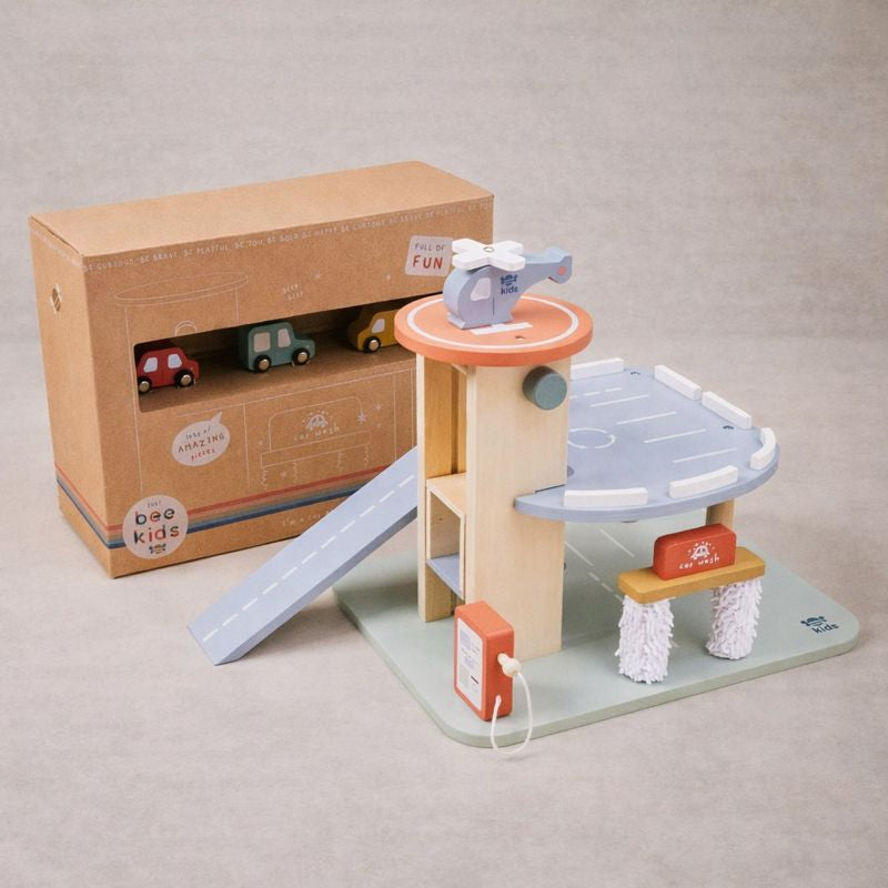 Speed drive all the way to playtime with this brilliant themed toy set. Crafted from durable wood and painted in a rainbow of colours, this garage set is perfect for encouraging learning through play. This play set comes with three wooden cars, a helicopter and a two-story parking garage complete with a lift, helicopter pad, car wash and much more. Little learners can spend hours driving the cars into the garage for a wash and refuel, or safely guiding the helicopter to land! Perfect for role-playing real-life scenarios, this set helps develop hand-eye coordination and fine motor skills.