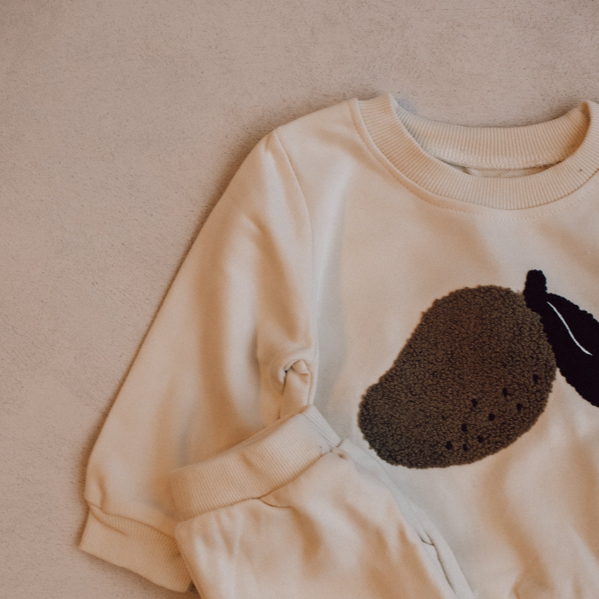 Super soft fruit print lounge sets featuring a cosy jumper and joggers, made from high-quality fabric for everyday comfort.