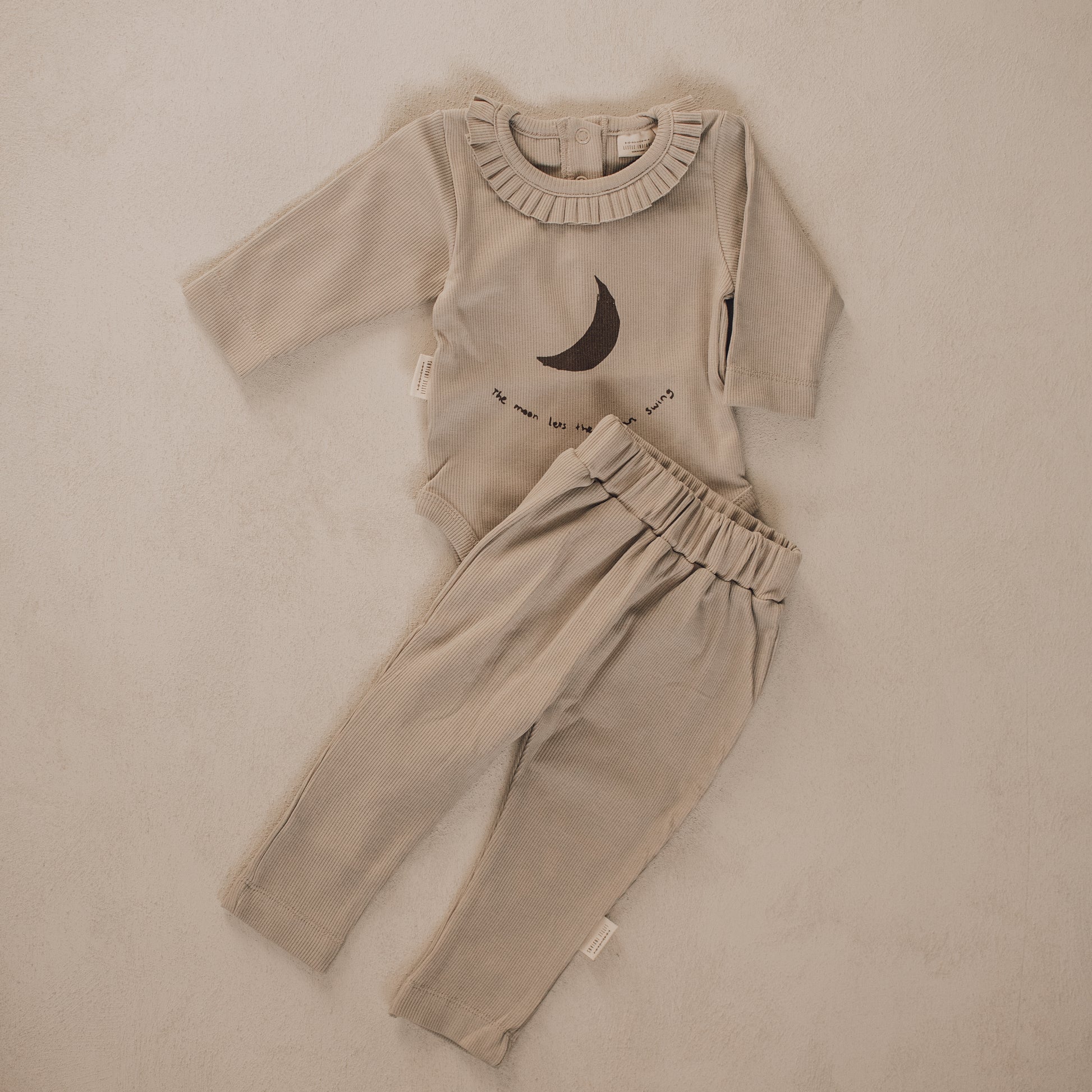 A soft ribbed bodysuit in a beautiful greige tone, finished with a subtle moon detail and a soft neck ruffle. Designed with practical poppers for easy dressing and made from comfortable, gentle fabric perfect for your baby.