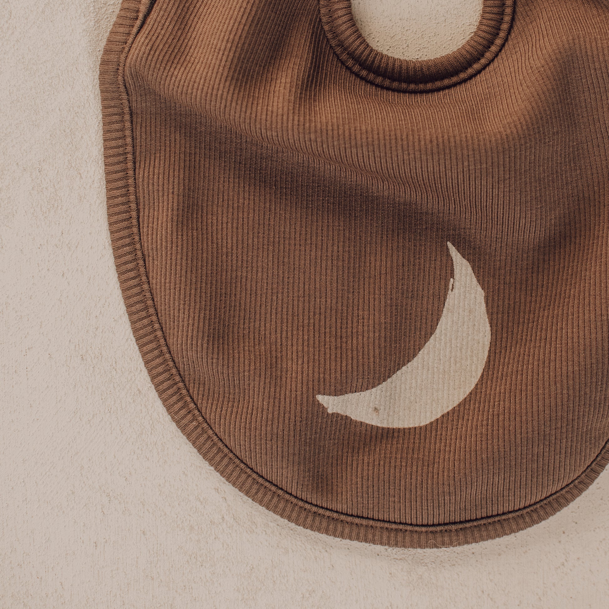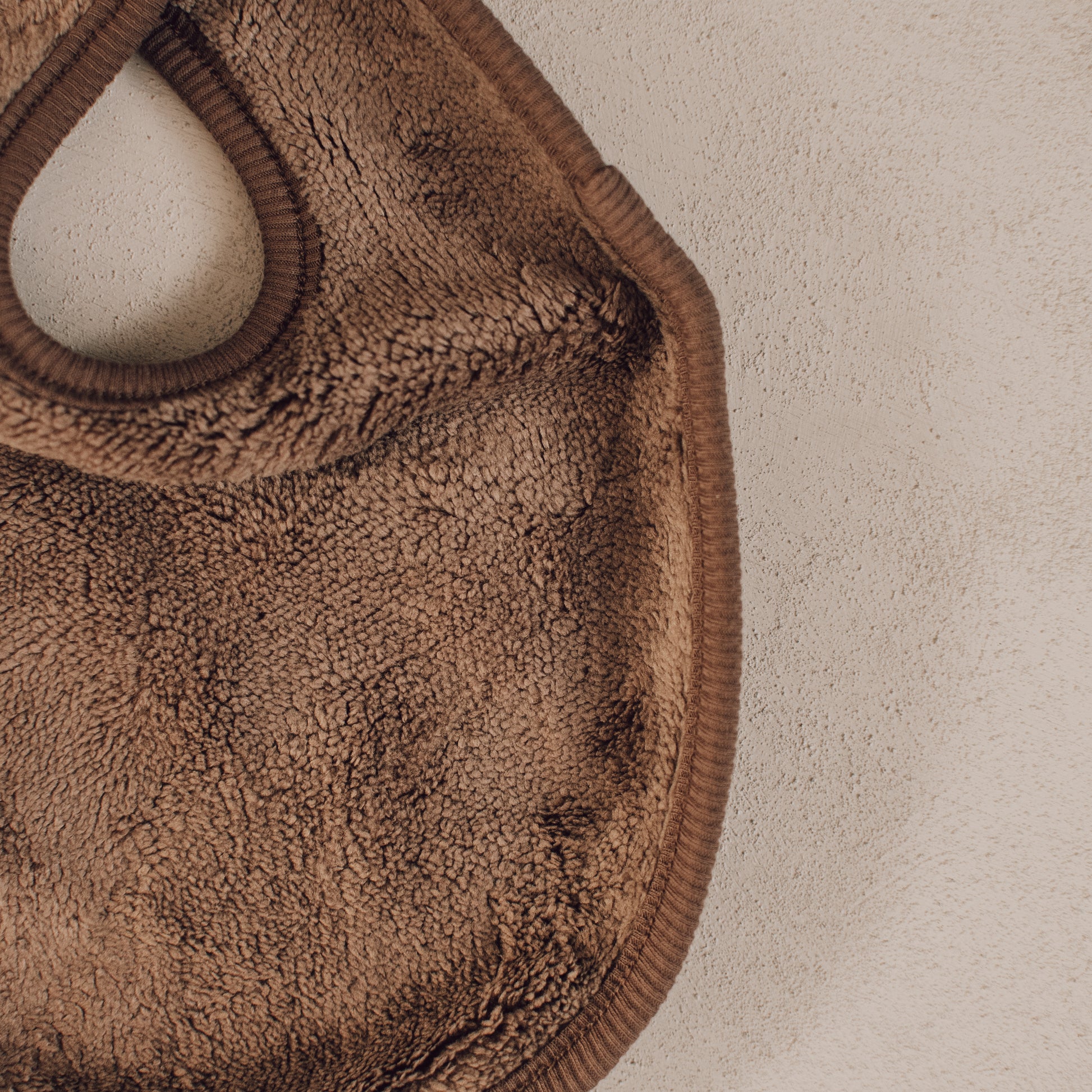 A thick, soft brown bib featuring a subtle moon detail. Designed with a plush, fluffy backing for extra comfort and excellent absorbency. Perfect for keeping your little one clean and cozy during feeds.